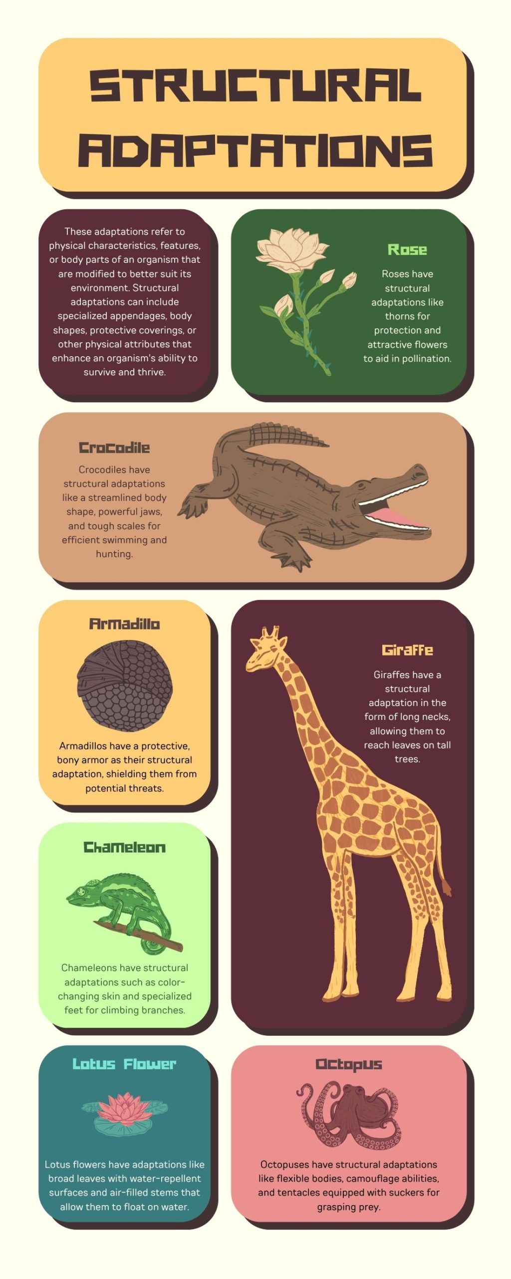 Nature is full of incredible design solutions, and structural adaptations are some of the most fascinating examples. These are the physical features that help animals and plants survive in their environments—from the long neck of a giraffe reaching treetop leaves to the spines of a cactus conserving water in the desert. This infographic highlights a range of these natural adaptations, showing how form meets function in the wild. Explore how evolution has shaped bodies to thrive in every corner of the planet, from the ocean depths to the highest mountain peaks.